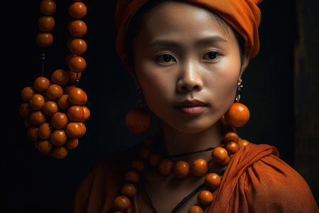 Captivating portrait of a woman with longan earrings and a matching necklace, showcasing the fruit's beauty in a unique and stylish way