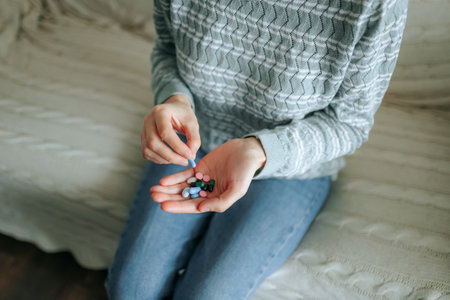 A woman hand take pills from the palm of his hand to take painkillers, medicines, vitamins or antibiotics. Close up. unrecognizable. At home. Indoor. Tablets, medicines