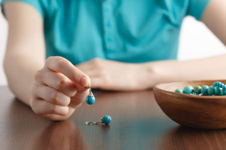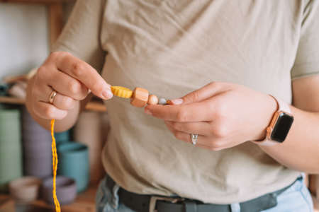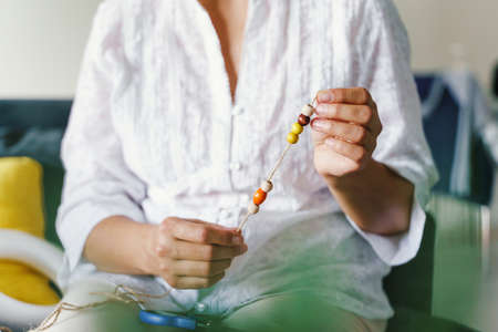 Close up on midsection of unknown female holding string with wooden or plastic pearls making nature materials bracelet necklace at home - Creative designer working Creativity hobby and leisure concept
