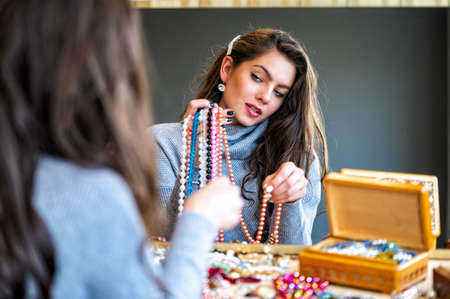 reflection of a woman in mirror choosing and trying different jewelry, soft focus, close-up