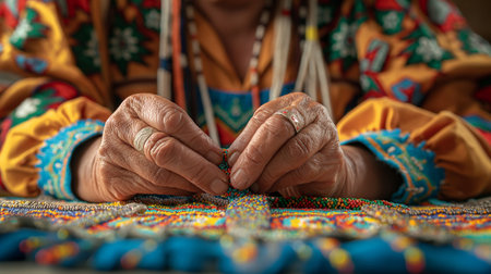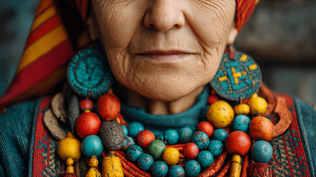 An intimate close-up of elderly hands gently cradling vibrant prayer beads, showcasing deep spirituality and rich cultural tradition, inviting reflection and peace.
