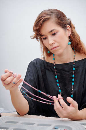 Serious pretty young creative woman looking at amethyst and turquoise stone necklace