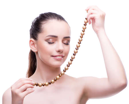 Portrait of an attractive girl with red lipstick on lips which keeps teeth black beads close-up isolated on white background