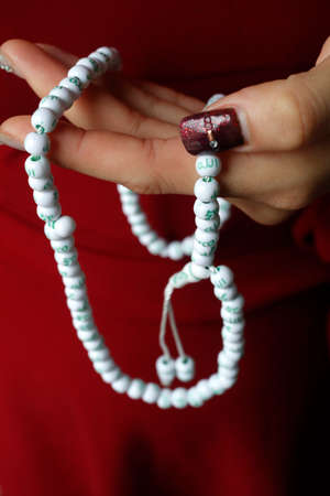 Man hand holding muslim rosary beads, tasbih over white background. Eid Mubarak Concept