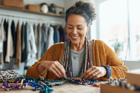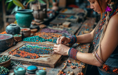 A Cherokee artist in her early 40s skillfully creates necklaces from vibrant beads at a wooden table in her well-lit workshop, showcasing her dedication to traditional craftsmanship.