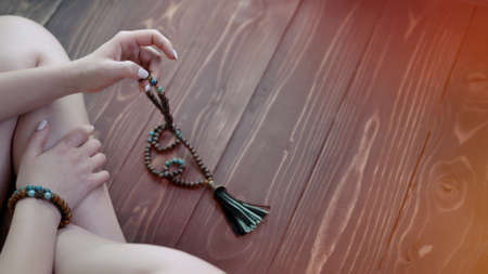 Woman lit hand counts mala beads strands of gemstones used for keeping count during mantra meditations. Lady sits on wooden floor. Spirituality, religion, God concept. Copy space