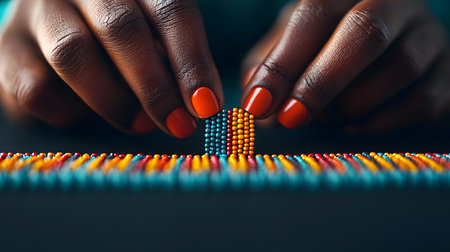 A pair of hands carefully arranges vibrant beads to craft a colorful jewelry masterpiece. The background is dark, enhancing the vivid hues of the beads and showing a passionate creativity.
