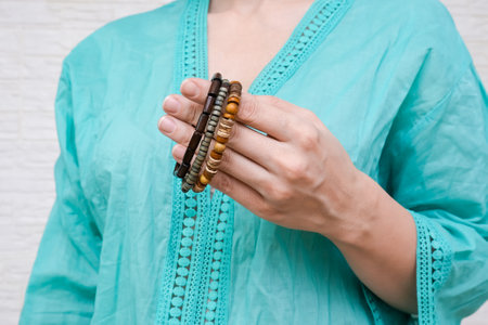 Unrecognized woman in ethnic clothes showing hand made bracelets with wooden beads on her hand