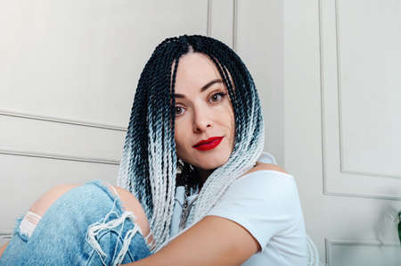 fashionable youth hairdo, colored hair, the result of the work of the master in the beauty salon, many small braids, interwoven through a pigtail crochet, an African style on European hair