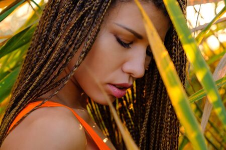 Portrait of beautiful woman with dreadlocks. red lipstick. romantic look.
