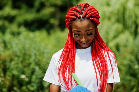 African red haired volunteer woman with clipboard in park. Africa volunteering, charity, people and ecology concept.