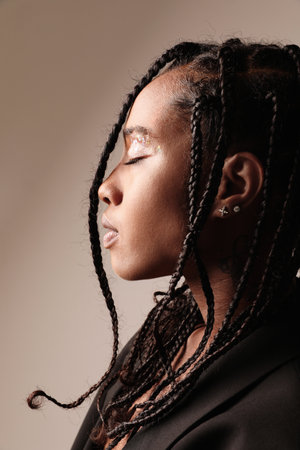 Woman with braided hair, golden and black makeup, natural beauty, tanned skin