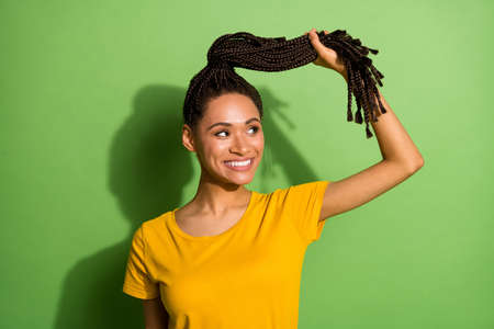 Photo of shiny cute dark skin lady dressed yellow t-shirt hands arm hair tail looking empty space isolated green color background