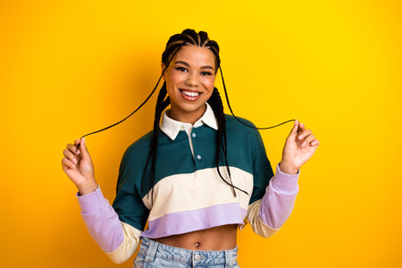 Portrait of a cheerful young woman posing in a striped crop top with braids on yellow background