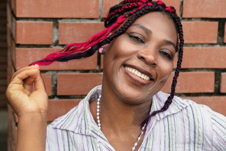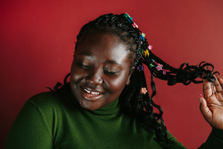 Beautiful African woman with braided hair and colorful clips smiling on red background