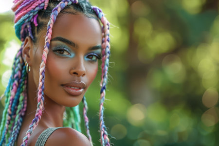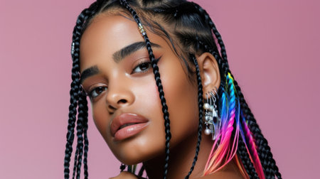 This captivating portrait showcases a young woman with stylish braids and colorful hair extensions, presenting a vibrant aesthetic against a pink background.