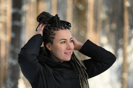 Young woman with African braids in natural winter environment landscape