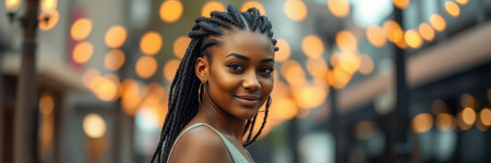 Woman with braided hair smiles in a vibrant urban setting filled with warm lights during the evening hours