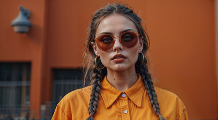 Portrait of a girl with braids in a yellow shirt and sunglasses