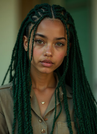 Portrait of a young woman with green braided hair in natural lighting.