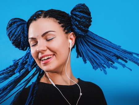Gorgeous lady with dyed african braids hairstyle listening music in headphones and singing on blue background. Charming girl in white earphones dancing with hair waving and eyes closed.