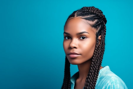 Close-up portrait of a beautiful young black woman with braided hair. Isolated on dark cyan background.