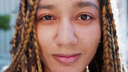 Shy African American female. Happy model smile. Young black woman smiling in selective focus outdoors, fashion hairstyle, happiness concept