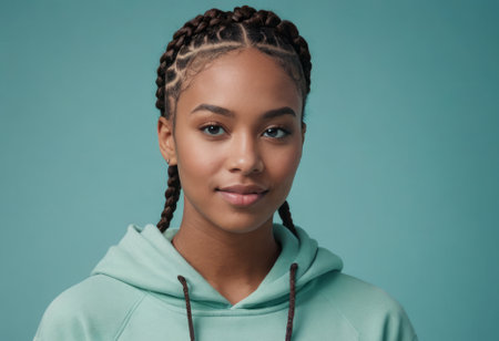 Young woman in a teal hoodie, her braided hair and serene expression offer a look of calm comfort.