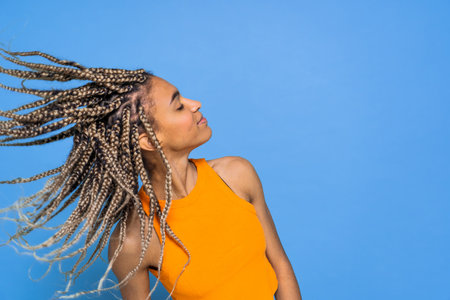 Young afro-american woman with braids on the blue background, copy space, Generative AI