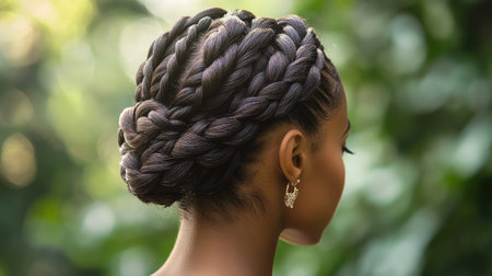 A dynamic shot of a woman with a braided updo, showcasing intricate braids and elegant styling, perfect for formal occasions or special events.
