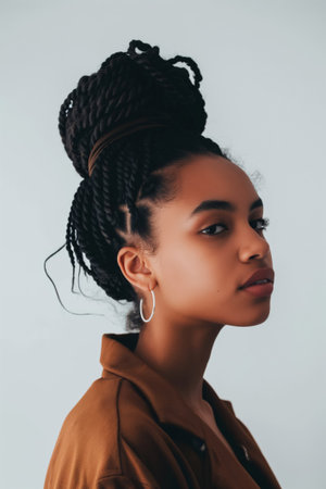 Pretty young afro-american woman with braids on the bright studio background, Generative AI