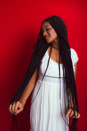 Portrait of young, beautiful woman, standing, messing with her hair braids. Isolated on red background.