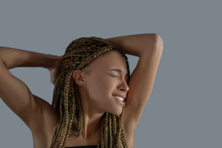 Portrait of a content young black woman with Afro braids against a blue background