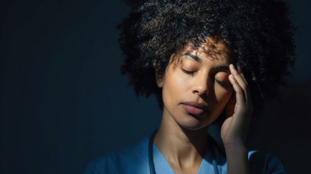 Healthcare worker shows signs of exhaustion and stress in a hospital as the weight of work affects her well-being in a moment of reflection.
