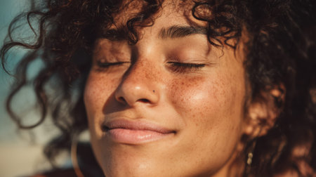 Young african female enjoying sunlight with freckles and curly hair.