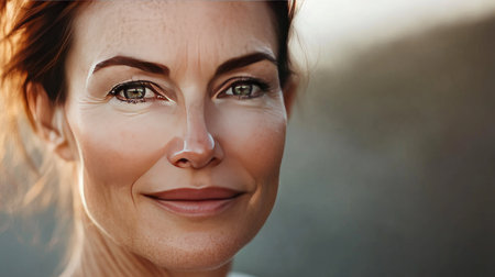 A close-up portrait of a woman showcasing natural beauty and grace. Her warm smile and confident gaze create a serene and inviting atmosphere.