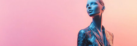 A stylish mannequin displays a modern outfit in a trendy pastel setting, illuminated with clean lighting and featuring a blank area for text.
