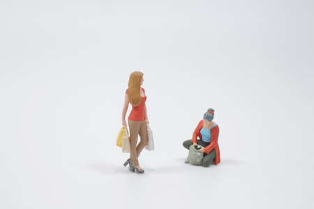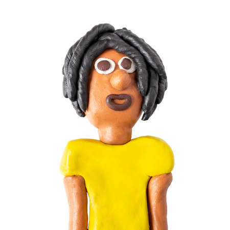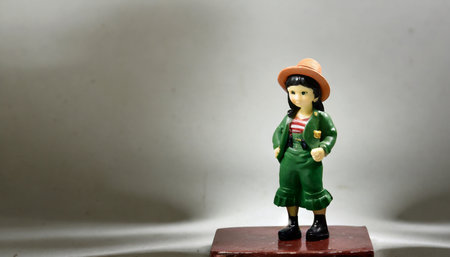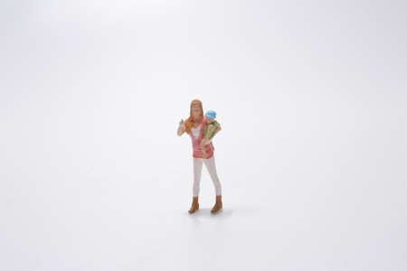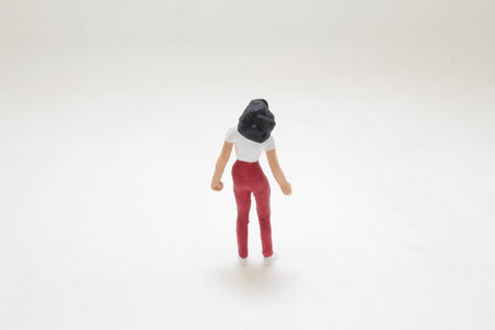 Small figurine of a woman in casual attire on a white background, symbolizing