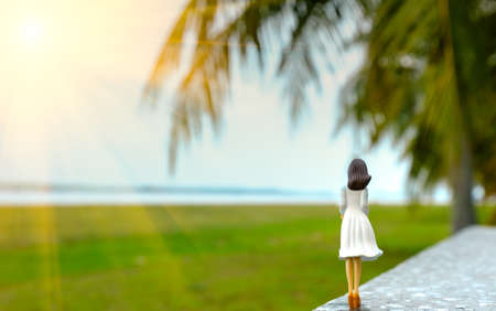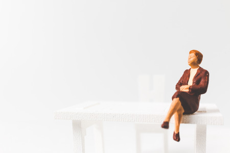 Miniature people, woman sitting on paper cup, concept of wife rest time