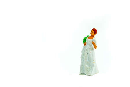 Miniature people office, worker and happy wedding party concept in variety action on white background with space for text