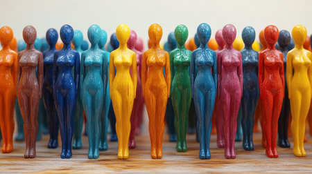 Colorful figurines stand together, showcasing diversity and vibrancy in composition.