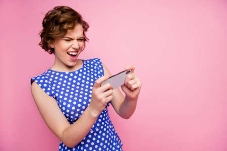 Close-up portrait of her she nice attractive lovely pretty addicted glad cheerful cheery brown-haired girl playing online game digital device having fun isolated over pink pastel color background