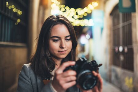 Photographer girl with retro camera take photo on background bokeh light in night city, Tourist travels in Barcelona, photo hobby. Outdoor portrait of young smile woman with video technology