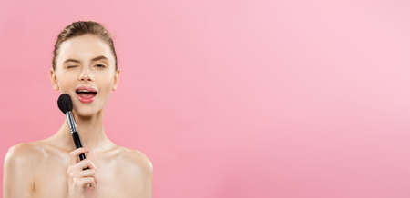 Beauty Concept - Closeup Beautiful caucasian woman applying makeup with Cosmetic Powder Brush. Perfect Skin. Isolated on pink background and copy space.