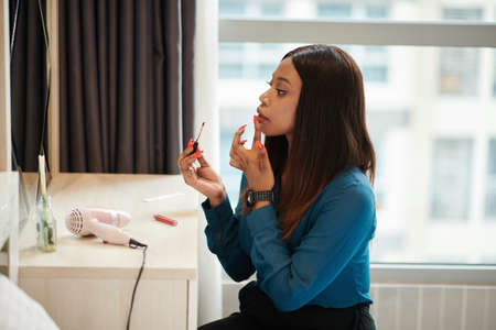 Elegant female entrepreneur doing makeup when getting ready for work in the morning