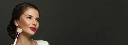 Perfect young cheerful woman holding makeup brush on black banner background with copy cpace
