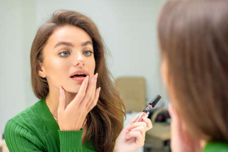 Beautiful young caucasian woman applies lipstick on her lips with her finger looking in mirror