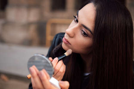 portrait of a young woman touching up her makeup in the street, concept of beauty
