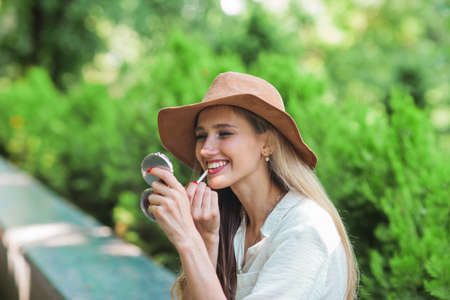 Cheerful blond woman in casual style wearing clothes and a felt hat does makeup with a lip liner and looks in mirror