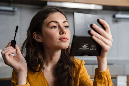 Smiling young brunette woman doing makeup while sitting in the kitchen at home, holding mirror and mascara
